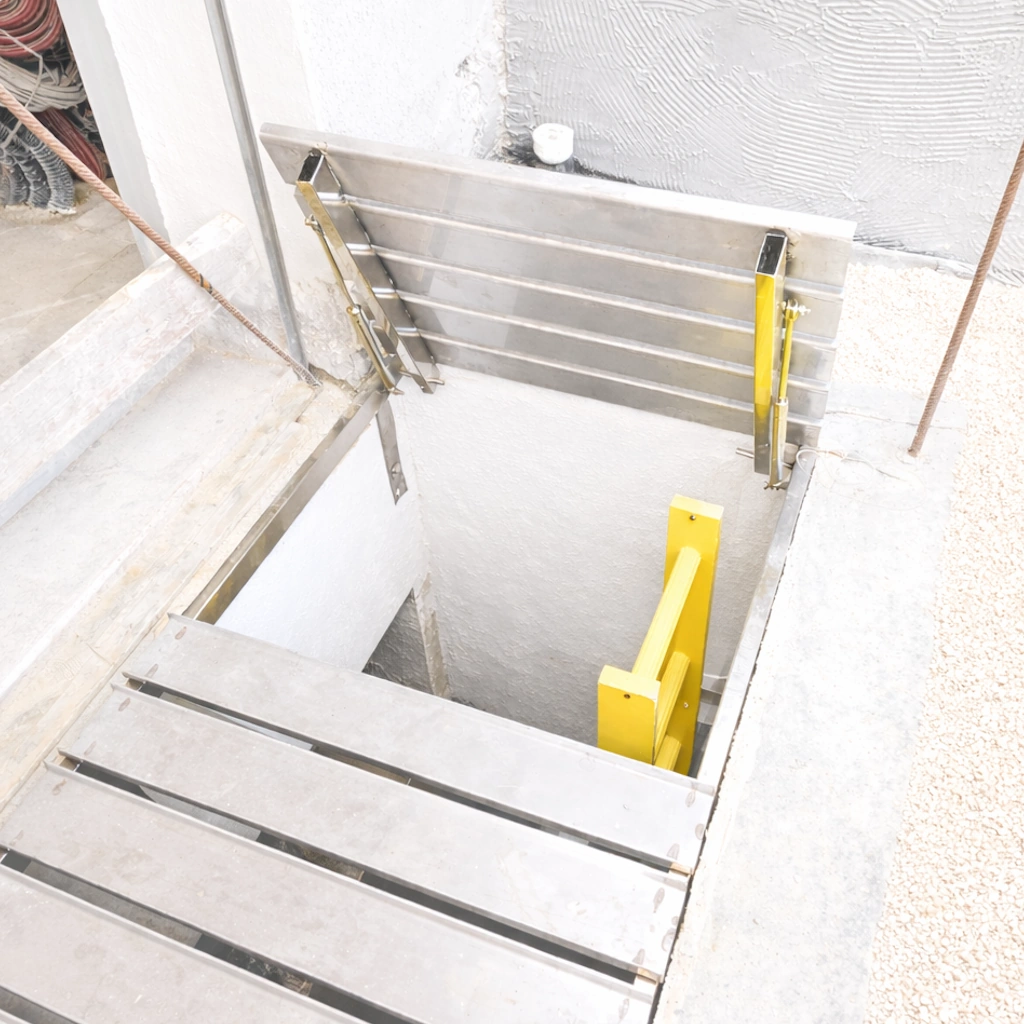 דלת מילוט לקירוי חצר אנגלית מנירוסטה 304, מיועדת ליצירת פתח ירידה בטיחותי ונוח כחלק ממערכת חיפוי החצר האנגלית. הדלת משולבת ריצוף מלא למראה אחיד ויוקרתי, ומאפשרת גישה למרתף או לחצר האנגלית תוך שמירה על בטיחות, נוחות ועיצוב נקי.
