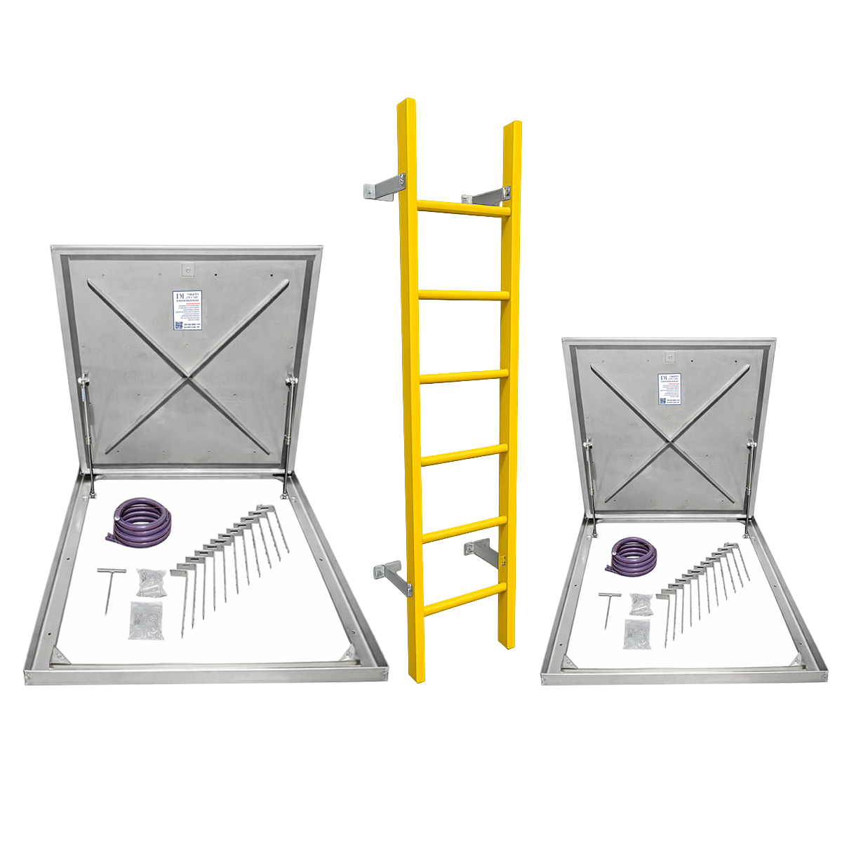מבצע סט מכסים לחדר מכונות – מכסה נירוסטה 100×100 עם סולם פיברגלס 190 ס״מ ומכסה תא איזון הידראולי 75×75