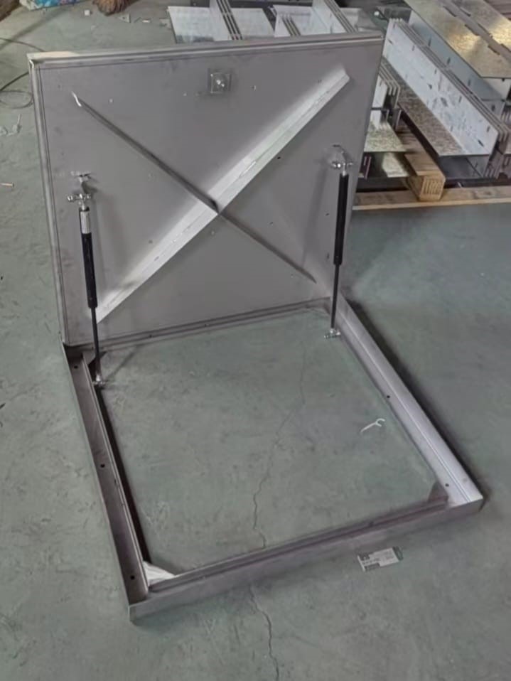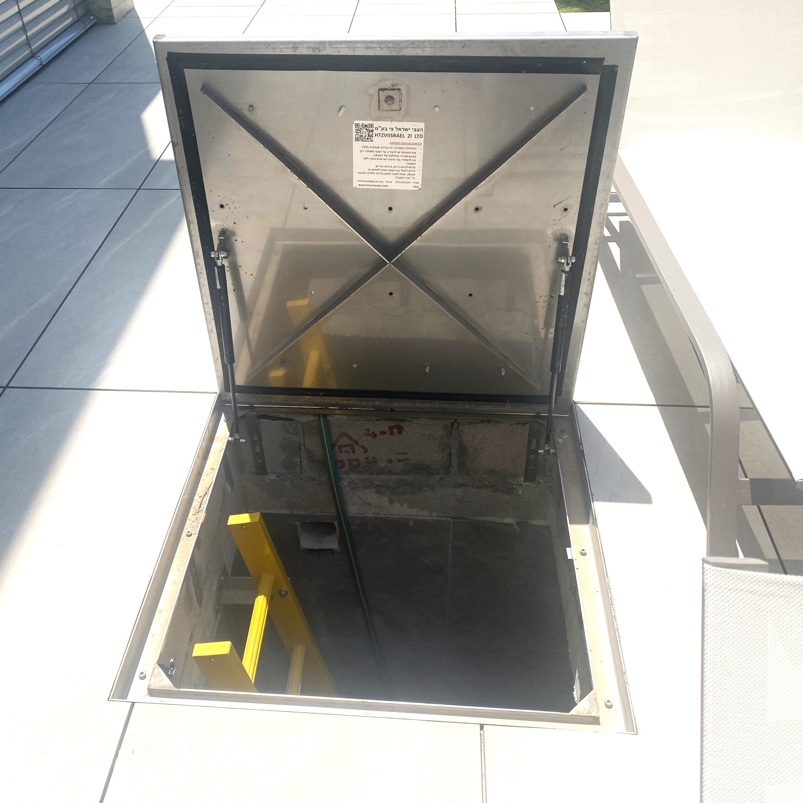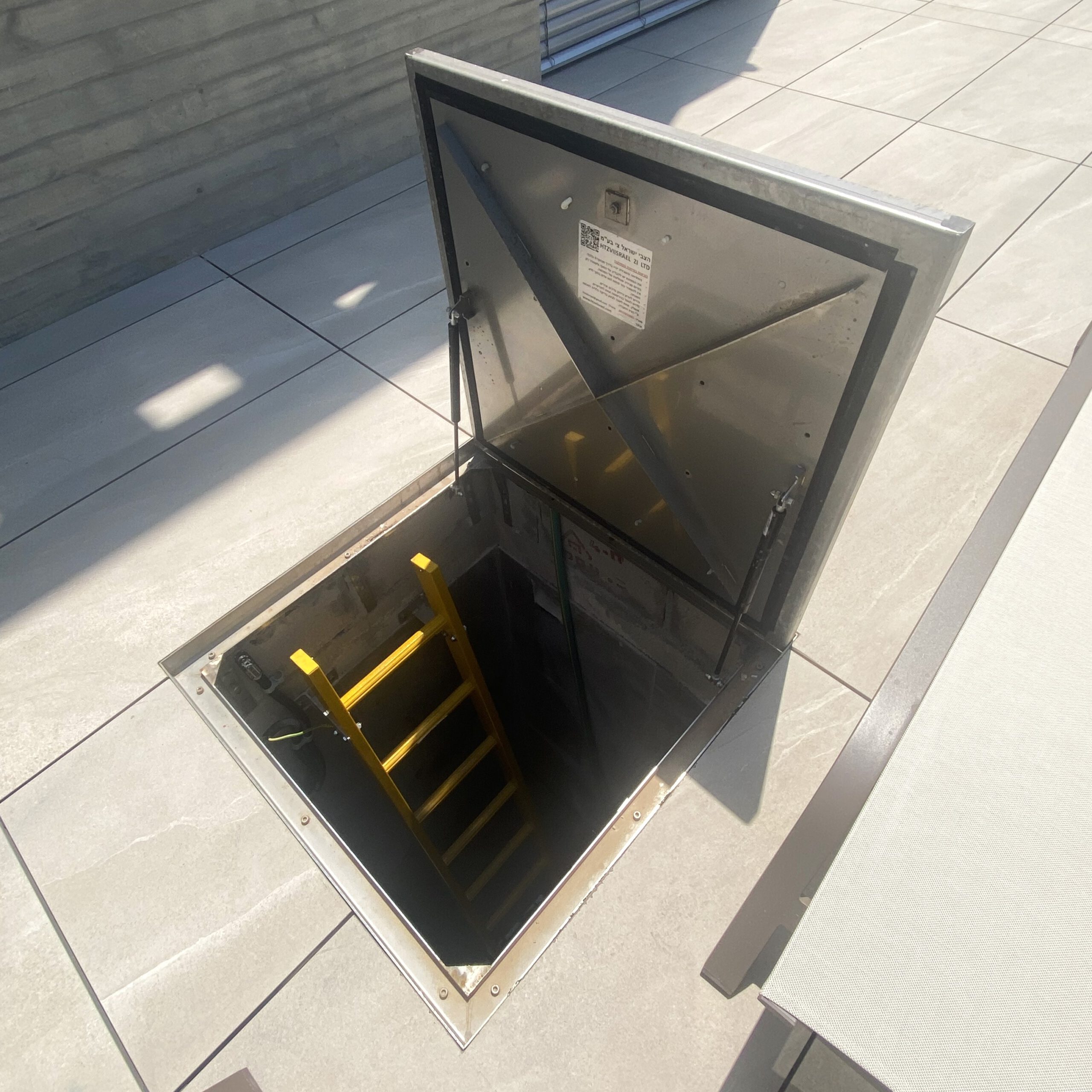 - מבצע סט מכסים לחדר מכונות – מכסה נירוסטה 100×100 עם סולם פיברגלס 190 ס״מ ומכסה תא איזון הידראולי 75×75
