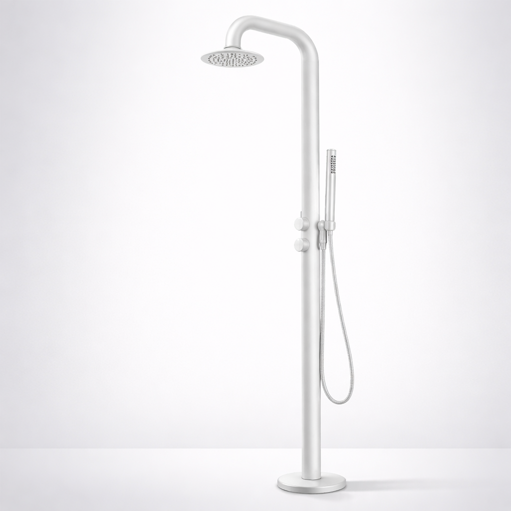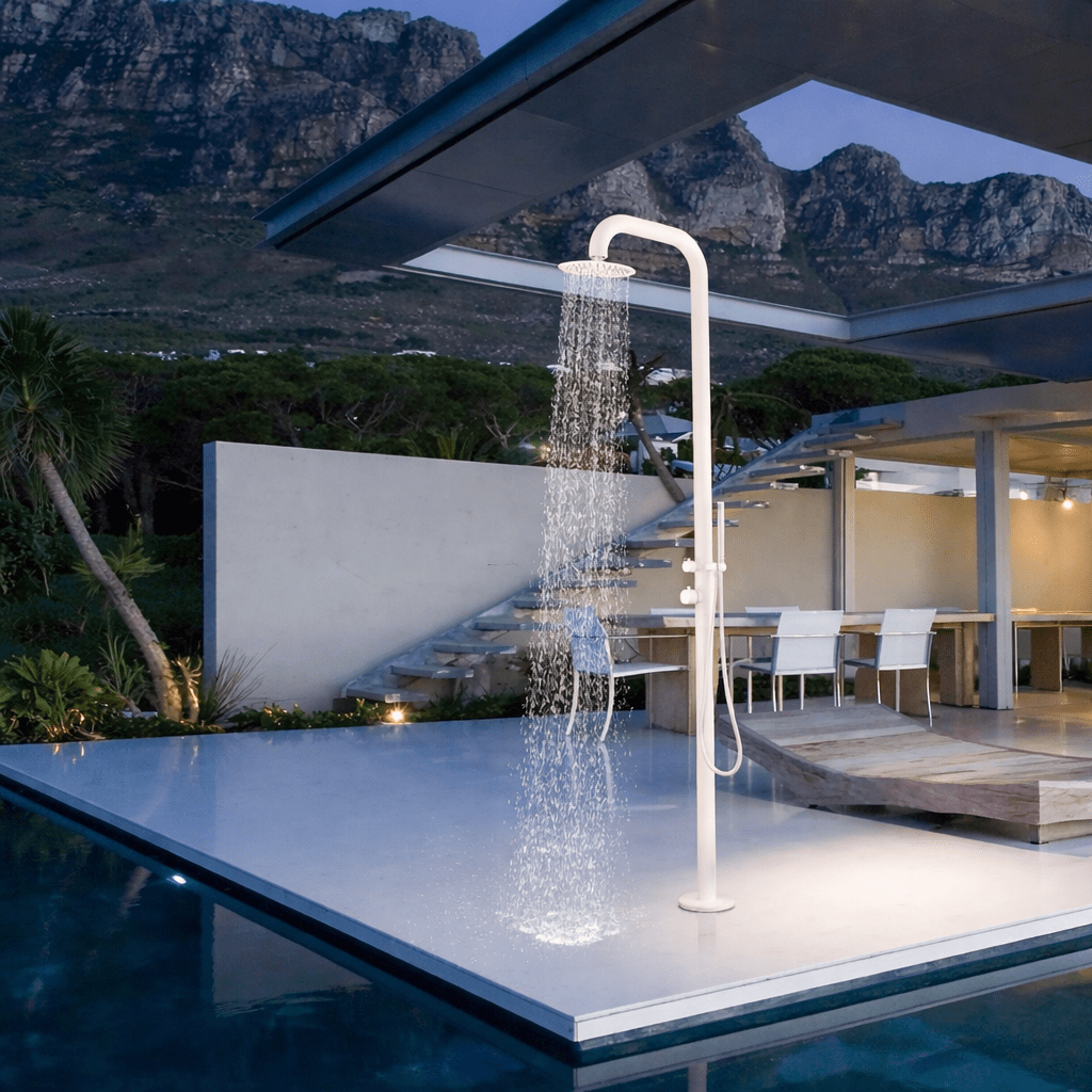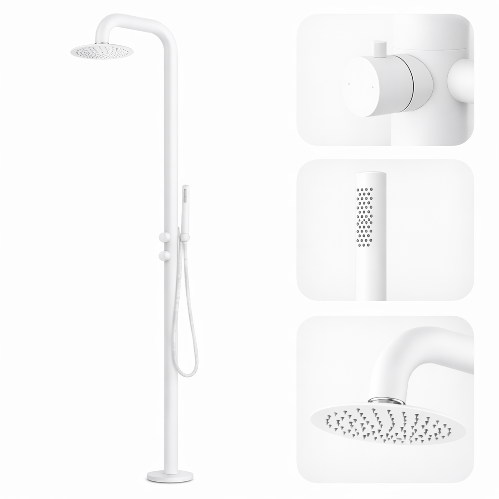 המקלחון מיוצר מנירוסטה 316 עמידה במיוחד ומתאים לשימוש בסביבה חיצונית עם לחות, כלור ותנאי מזג אוויר משתנים. הגימור הלבן מעניק מראה מודרני ואלגנטי המשתלב היטב בגינות, חצרות ובבתים עם בריכות פרטיות.