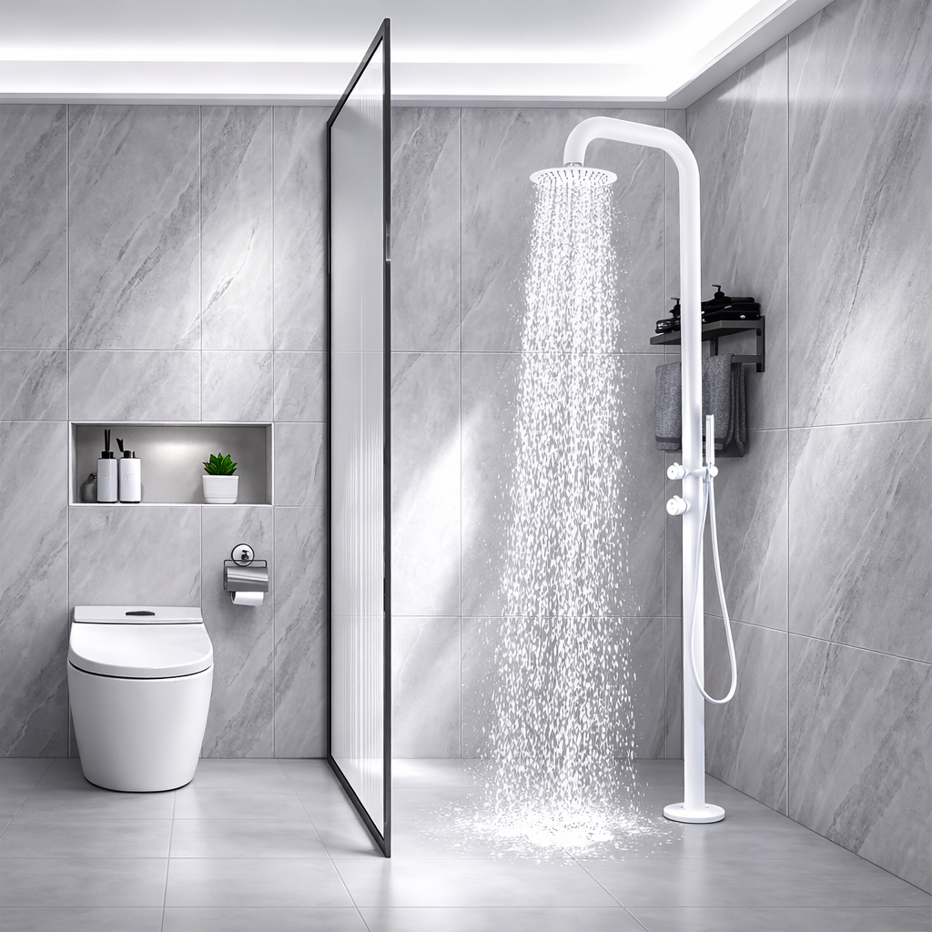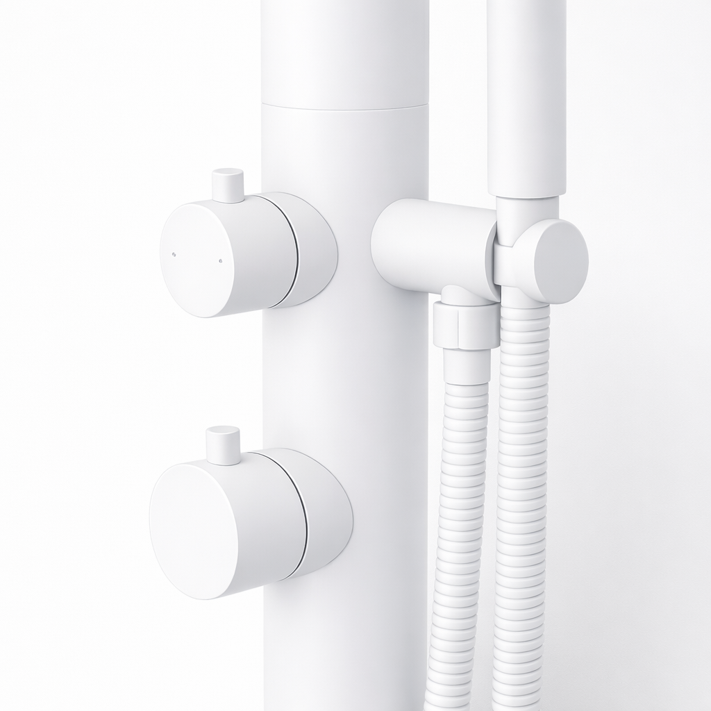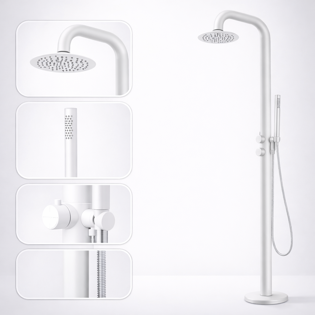 המקלחון מיוצר מנירוסטה 316 עמידה במיוחד ומתאים לשימוש בסביבה חיצונית עם לחות, כלור ותנאי מזג אוויר משתנים. הגימור הלבן מעניק מראה מודרני ואלגנטי המשתלב היטב בגינות, חצרות ובבתים עם בריכות פרטיות.