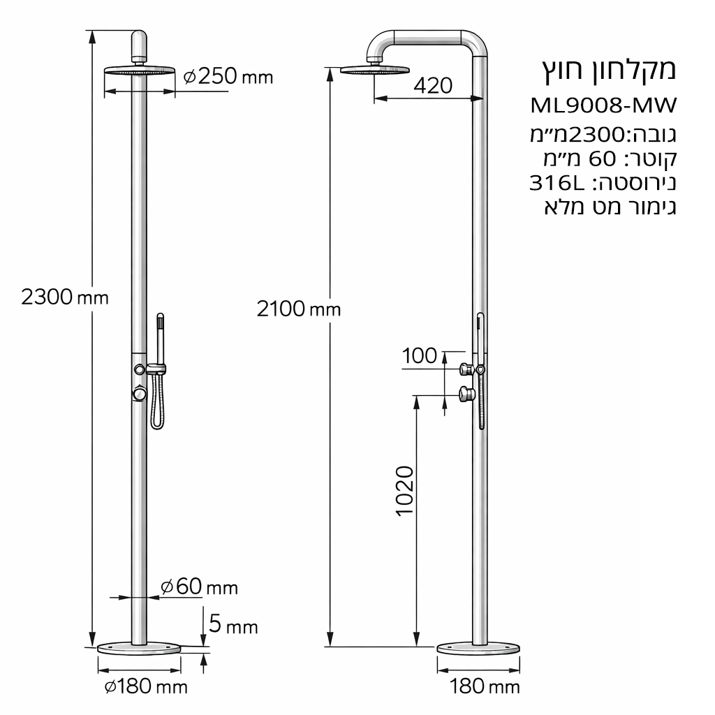 - מקלחון חוץ מנירוסטה דגם: ML9018